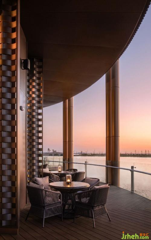 越過水景小園,步入全日餐。疏朗開闊的空間里,線與面交織出美的韻律。豎條御窯金磚或有序嵌入墻面,或穿插翡翠紋理接待臺。太平船模解構(gòu)再譯,褐鐵色碎片攢動(dòng)點(diǎn)點(diǎn)漁火凌空,恍然踏入水巷楓橋。