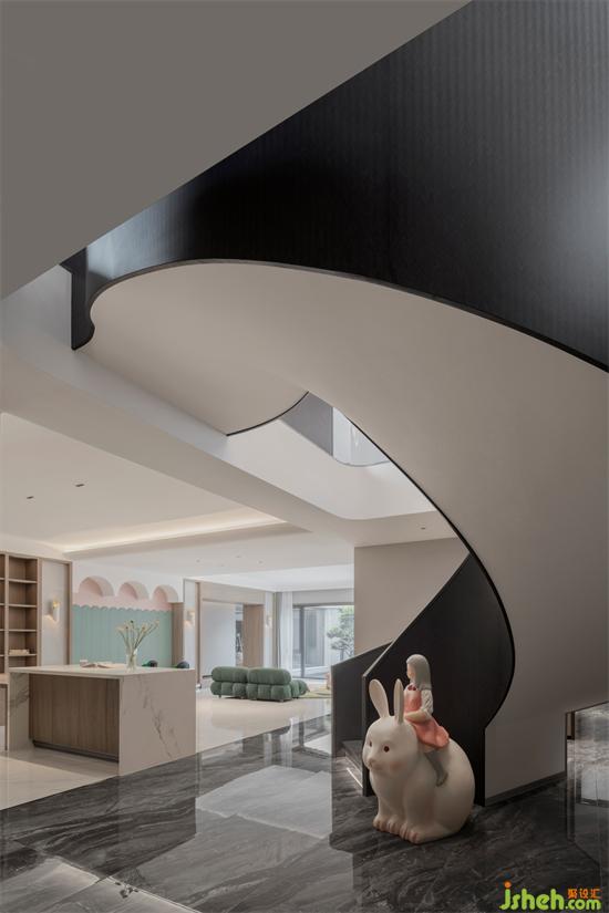 在樓梯設(shè)計(jì)中,我們改變?cè)挤忾]式直角樓梯,別墅設(shè)計(jì)將四周墻體完全打開(kāi),以開(kāi)放式旋轉(zhuǎn)樓梯代之。一來(lái)消除上下樓的隔絕感,二來(lái)增大空間的互通性。