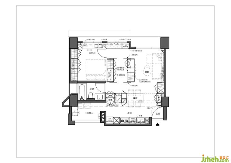 美型廚具座落入門玄關附近,高貴的藕灰色嵌入于墻面,家裝設計透過餐廳上方與收納柜體連接而成的藕色拱門做為空間的框景,界定餐廳與客廳的區(qū)域。在材質(zhì)上,金色的金屬點綴式的從廚房壁磚延伸至客廳家具桌腳,再跳躍到主臥旋轉鏡框,串聯(lián)起開放空間,并且營造屬于輕熟女的奢華質(zhì)感。