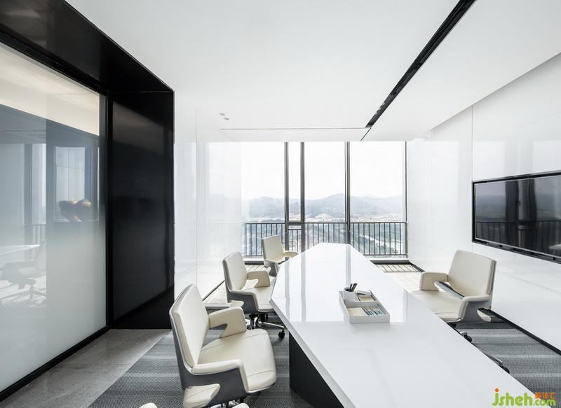 作為立意的基點(diǎn)“天光云影”并不能生硬的搬到室內(nèi)。同時(shí),把窗外景色盡可能引入到每一個(gè)辦公位又成為設(shè)計(jì)的課題。作為辦公空間的常態(tài),不到一定層級(jí),大抵都是終日向隅一隅。設(shè)計(jì)師深諳其苦。綜合環(huán)境和人文的需要,在呈現(xiàn)空間狀態(tài)的設(shè)計(jì)中,設(shè)計(jì)師不糾纏于瑣碎,而是大刀闊斧利用重新建構(gòu)的框架的基礎(chǔ)面形成的線條作展開。在色調(diào)上,設(shè)計(jì)師以白為基調(diào),以材質(zhì)賦予其形成微妙的異同狀態(tài),利用光的變化和重顏色的點(diǎn)線豐富空間形態(tài)。設(shè)計(jì)師在設(shè)計(jì)過程中,將空間當(dāng)作一個(gè)素而稍顯斑斕的觀景空間加以考慮,使用適量的綠植穿插其間,以與戶外天然作情態(tài)上的呼應(yīng)。在空間結(jié)構(gòu)重新整合之后,呈現(xiàn)出抬頭即眺遠(yuǎn),在使用者心理層面喚起“天光云影”的印象,調(diào)節(jié)使用人士在該空間的心理狀態(tài)。