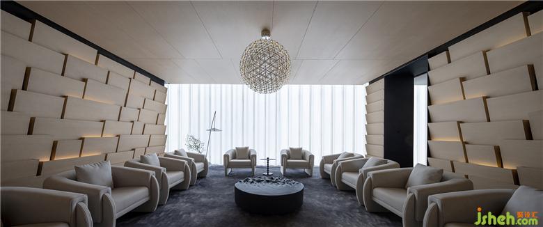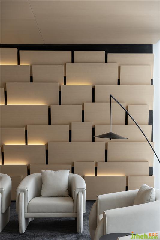 三層空間圍繞著中心的藝術裝置,由一個個彼此獨立而私密的功能板塊構成,材質上延續(xù)了整體空間的調性,卻切換了不同的面向,轉而以木質作為墻面,深色的絨面地毯,包裹起必要私密屬性,將開放的角度完全聚焦室外的景色。