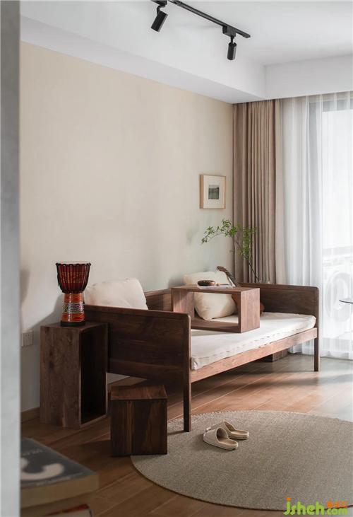 客廳朝南早晨陽光透過窗戶將溫暖傾注于室內(nèi),自由放松的生活由此開始,舟山裝修設(shè)計將細碎的時間編織成可觸摸的溫柔??蛷d木質(zhì)羅漢床搭配棉麻質(zhì)感的布藝坐墊最讓人感覺親近。