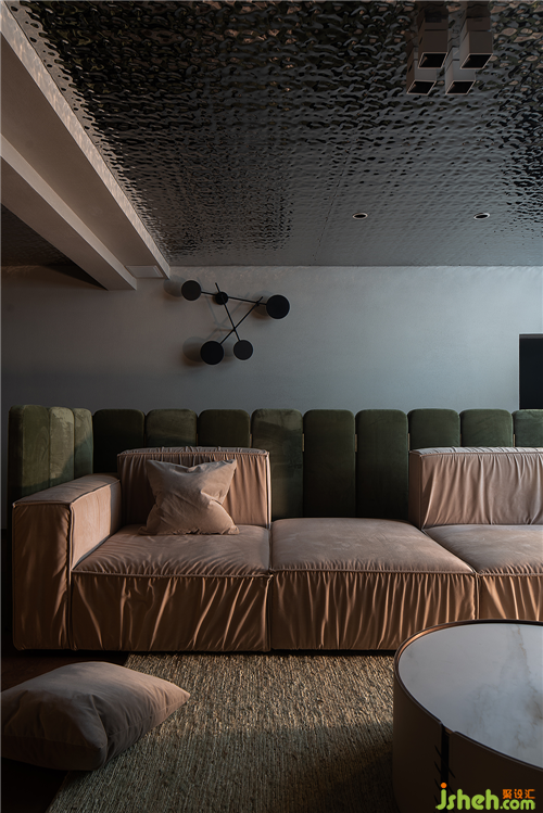 拾級而下的地下空間,由于層高的限制,空間頂面采用波紋鏡面質(zhì)感,解決了空間壓抑的缺點,模糊了空間的界限。