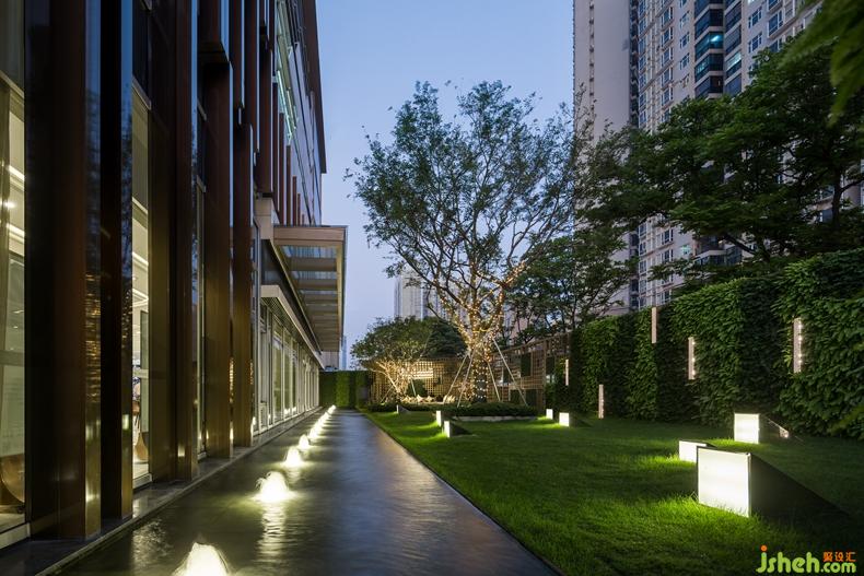 連綿的地景,搭配輪廓分明的音樂草地?zé)?,設(shè)計(jì)公司通過這些簡單而微妙的關(guān)聯(lián),與整體設(shè)計(jì)元素相呼應(yīng)。綠植墻的設(shè)計(jì)讓綠在立面上得以延續(xù),塑造出了空間的多維層次感。