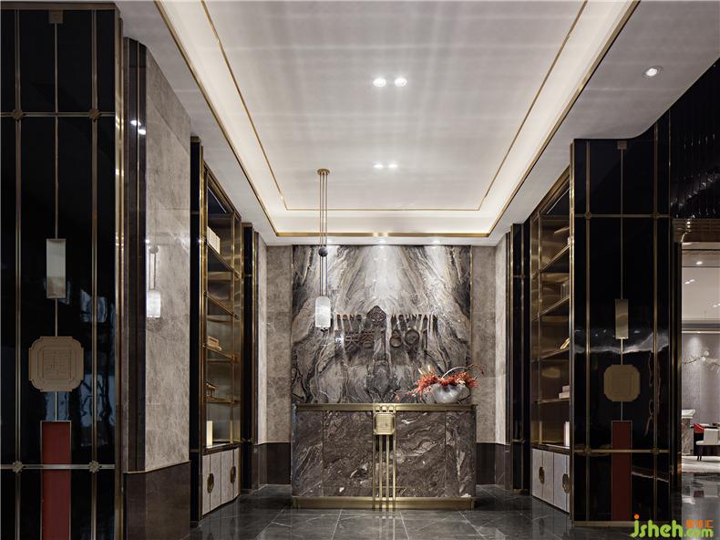 一處建筑的表現張力往往從公共空間開始,黑灰色調襯托著鎏金色度的優(yōu)雅,方正開闊的空間秩序鋪陳著儒雅的敘事邏輯,移步亦趨的旱景作品鋪設出古韻的藏墨畫卷,讓空間遐帶一隅夢回之境,對話中式美學的謐靜。
