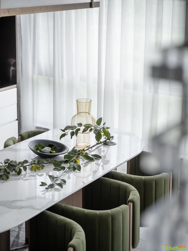 餐椅面料運用正如花草果實的關(guān)系一般,營造春意盎然的藝術(shù)美感,樣板房設計桌面上綠的白的都像生長出來的果實一樣,我們一口吃下陽光,一口吃下時光。