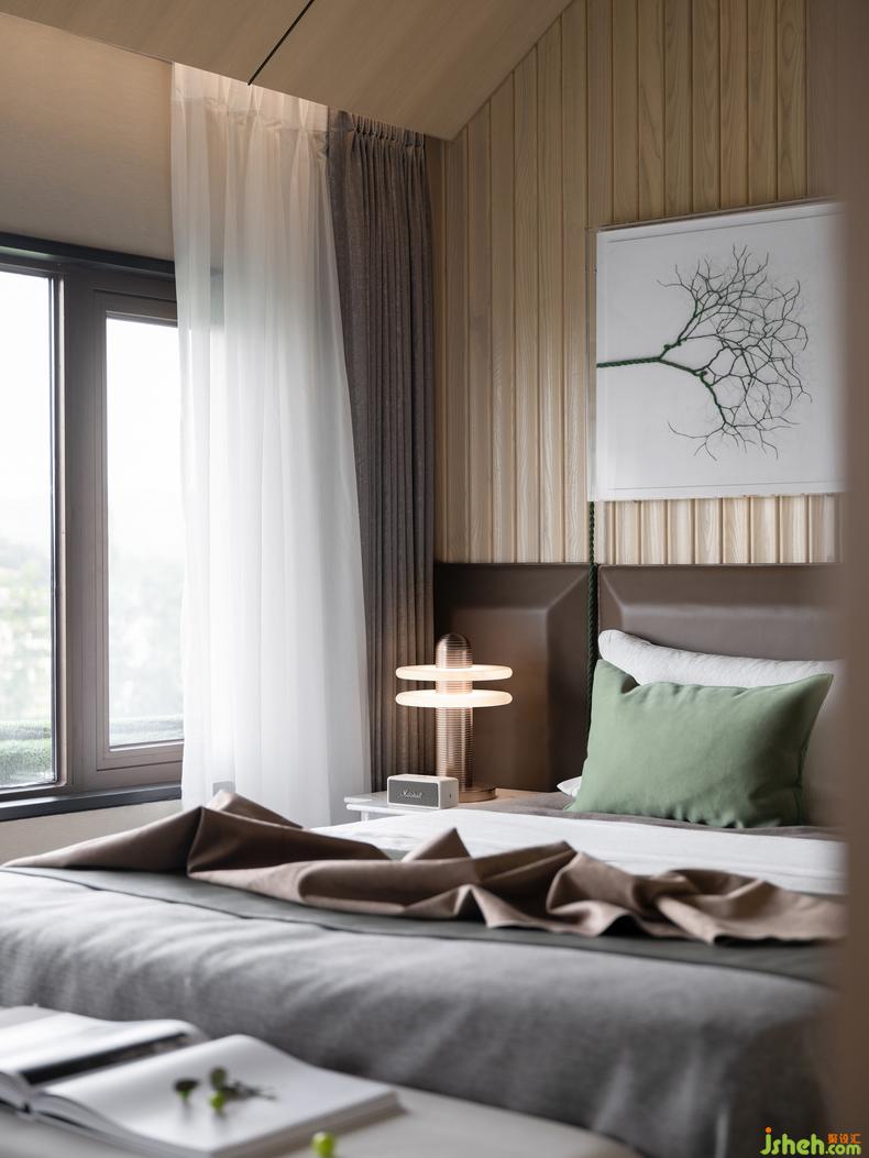 主臥丨摒棄繁復的裝飾是一種自由的觀感,在某種意義上,一體化軟硬裝空間,通過簡約的木質基調進行空間架構,保證了空間的整體感,也讓舒適不言而喻,頂部的角度裝點和縱深的視覺鋪陳,在落地飄窗的映射下充滿靈動,營造著一種東方的韻律和價秩序的考量。