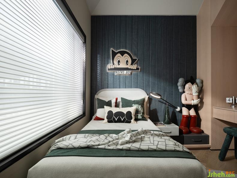 兒童房延續(xù)簡(jiǎn)約的設(shè)計(jì)氛圍,樣板房設(shè)計(jì)通過太空灰色調(diào)與阿童木元素的童趣搭配,多功能的書臺(tái)與置物,讓美感和趣味在這個(gè)空間里自在蔓延,給成長(zhǎng)多一分輕松與歡快。
