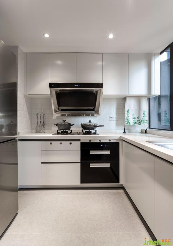 廚房墻用面包磚,櫥柜的黑色線條更顯利落。