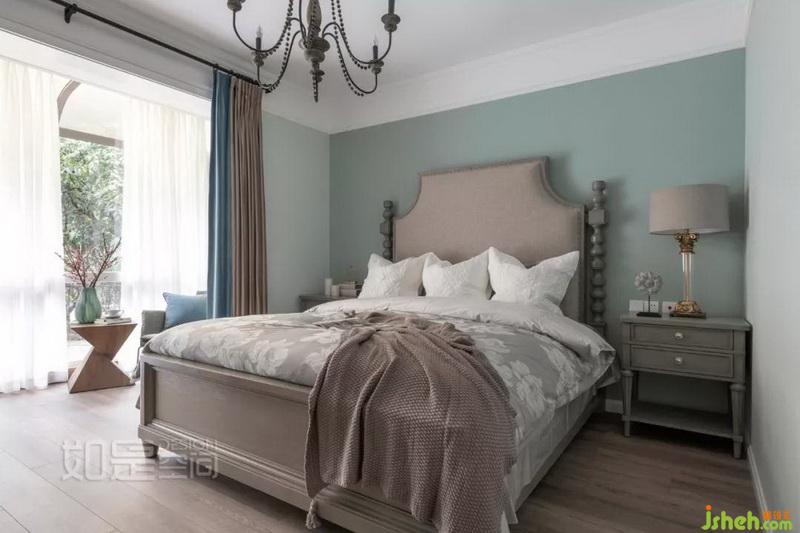 主臥色調(diào)為清新灰綠色,背景色略深一號,層次分明。家具采用和客廳同色系的煙灰色木系。吊燈讓人感受到濃濃的復(fù)古情懷,彰顯屋主優(yōu)雅氣質(zhì)。