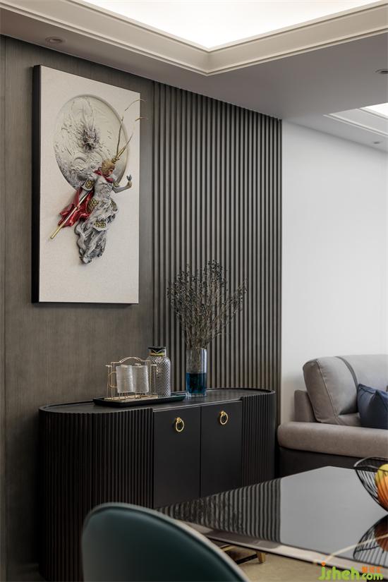 餐廳采用了大面積胡桃木設(shè)計(jì),間錯(cuò)搭配灰色墻面,家裝設(shè)計(jì)空間層次感更加豐富。餐桌和斗柜設(shè)計(jì)精巧別致,體現(xiàn)了業(yè)主高雅的審美。