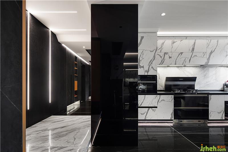 雙開門的冰箱被藏在了兩片黑色玻璃圍成的隔斷之中,也算是物盡其用了。仔細(xì)看你還會發(fā)現(xiàn),廚房的踢腳線都是帶燈光的,而臺面則是與地面大板顏色一致啞光肌理的超薄巖板,細(xì)節(jié)之中高級感無處不在。