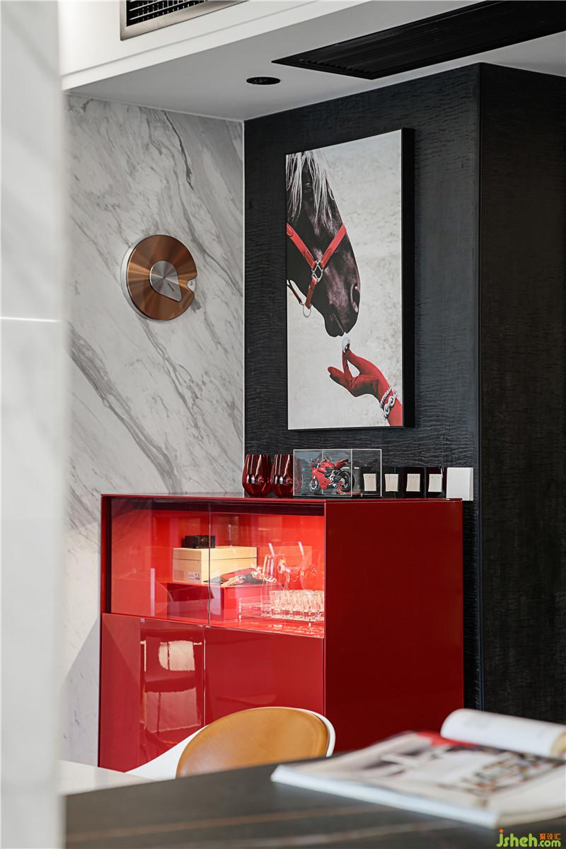 地面選用了900x1800cm的黑色大板,映襯白色的Boconcept餐桌椅和白色大理石墻面。黑與白的藝術(shù)從來不會(huì)落伍。