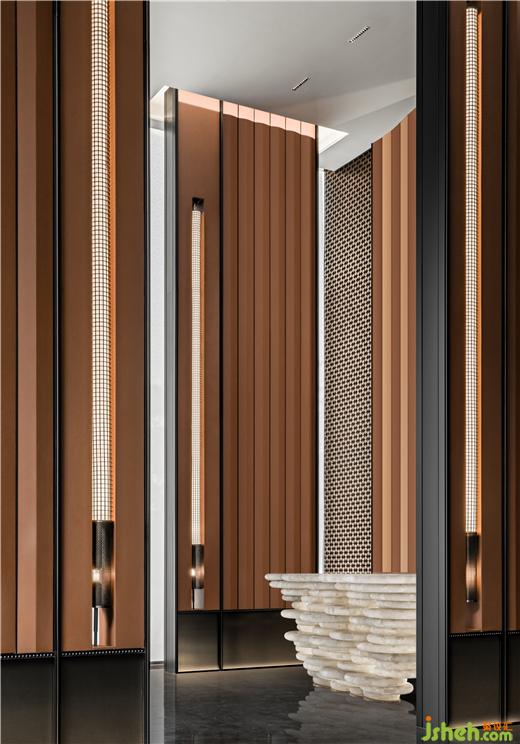 接待臺云母層疊,以自然典雅的姿態(tài)端坐此處,詮釋私家定制的奢華理念。背光金屬穿孔板仿若星空夜景,與肅然縱列的隔板呼應(yīng),光影虛實(shí)之間動靜相宜,盡顯設(shè)計(jì)張力與大盤格調(diào)。
