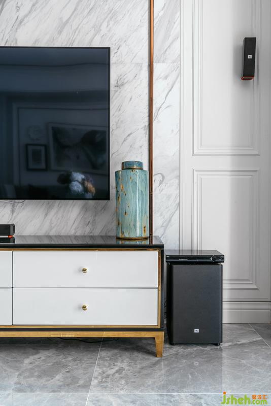 客廳,以灰白大理石紋主墻色做背景,搭配古銅色做矩形鑲邊點綴。