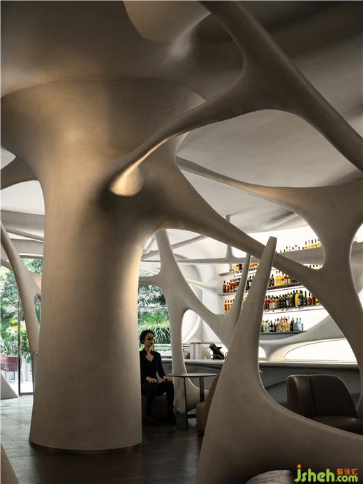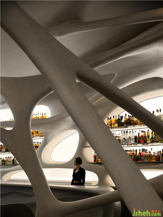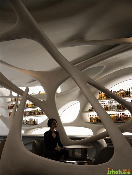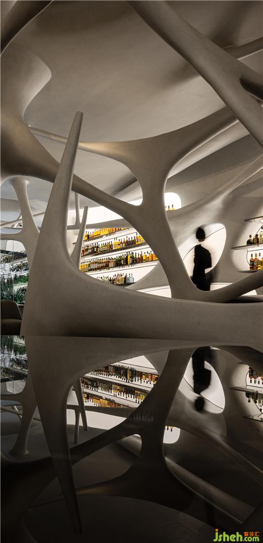 我們正在努力去洞察環(huán)境的基因,然后試圖去破解,在城市的基因中制造分裂,重新組織新的肌理。Tan90°酒吧設(shè)計(jì)在空間設(shè)計(jì)本身之中內(nèi)部具有自由性,空間更像是未來的機(jī)器的心臟,會(huì)在不同的情景中運(yùn)作起來。空間的流動(dòng)感與人產(chǎn)生對(duì)話,形成了動(dòng)態(tài)的場(chǎng)景組織,而空間反饋給人的這種意念也是空間記憶的一部分,它可以是洞穴,太空艙,神經(jīng)元等等,但這一切都離不開白天咖啡的一種適度與晚上威士忌輕微躁動(dòng)的切換。