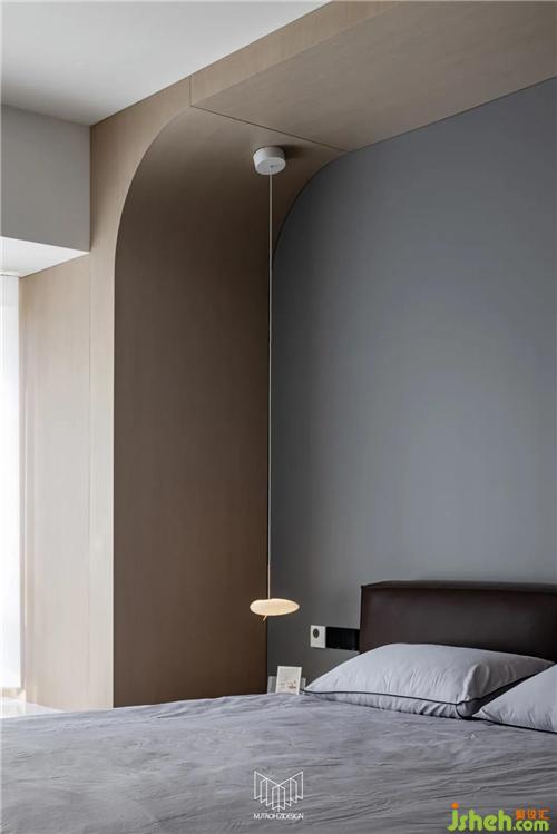 主臥室區(qū)域若按照原有結構布局,會致使房間過道面積過于浪費,無法使用。因此通過墻體局部拆除,使得主臥室、主衛(wèi)空間更加整體化,主臥室放置了一張1.8m雙人床,并定制了多組儲物柜,儲物空間得以滿足的前提下,電視機內(nèi)嵌于柜體內(nèi),使空間更加干凈、利落。根據(jù)業(yè)主的喜好,將材質、色彩、光源巧妙融合,營造一種安靜、舒適、愜意的空間氛圍。